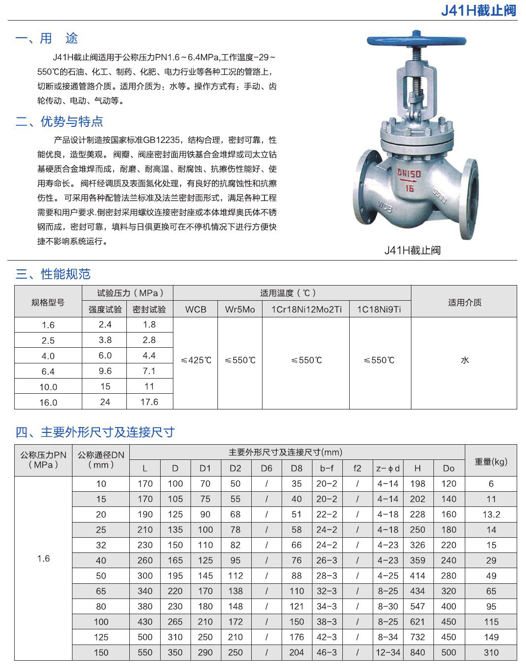 J41H截止阀适用于公称压力PN1.6-6.4MPa,工作温度-29~550的石油、化工、制药、化肥、电力行业等各种工况的管路上,切断或接通管路介质。